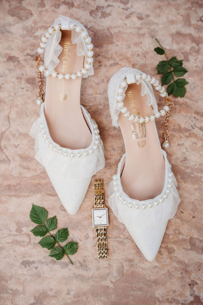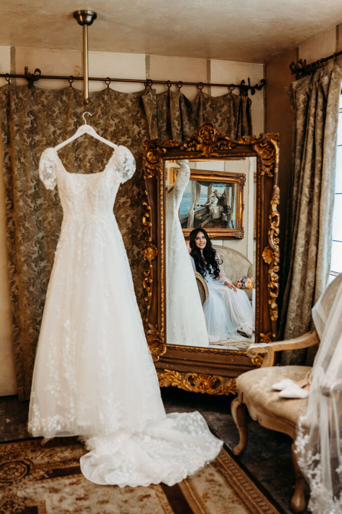 Inside the bridal suite, excitement blended with calm anticipation. Soft laughter filled the room as bridesmaids stepped into their pastel gowns, creating a light and whimsical palette that paired beautifully with the setting. Josselin’s gown hung near the window, glowing under the morning sun and highlighting the delicate details she chose with such care.