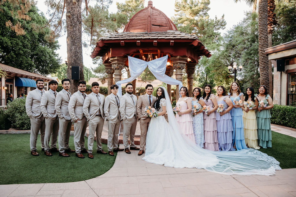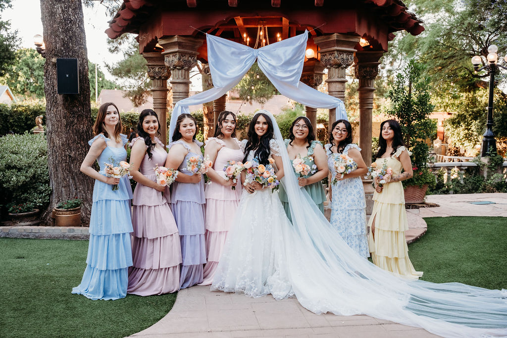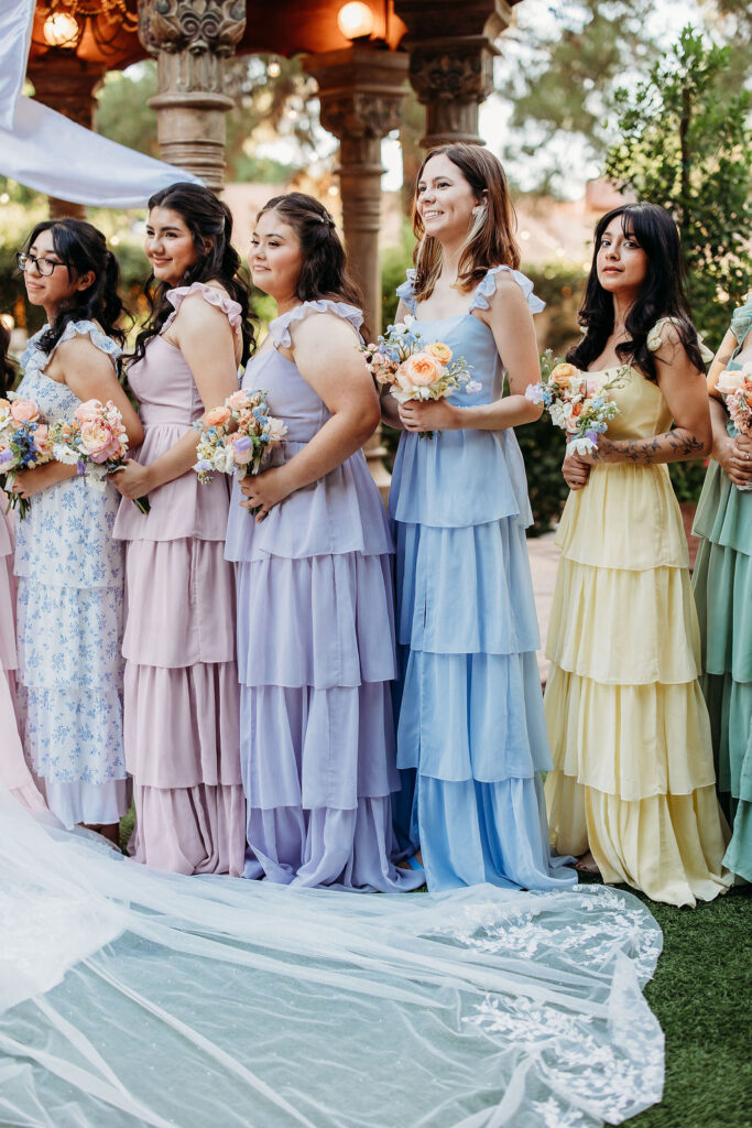 After the ceremony, the gardens became the perfect backdrop for portraits. The bridesmaids looked lovely in their pastel dresses, each shade blending effortlessly with the surrounding greenery. These soft tones created a dreamy aesthetic that enhanced the romantic feel of this romantic Arizona outdoor wedding.