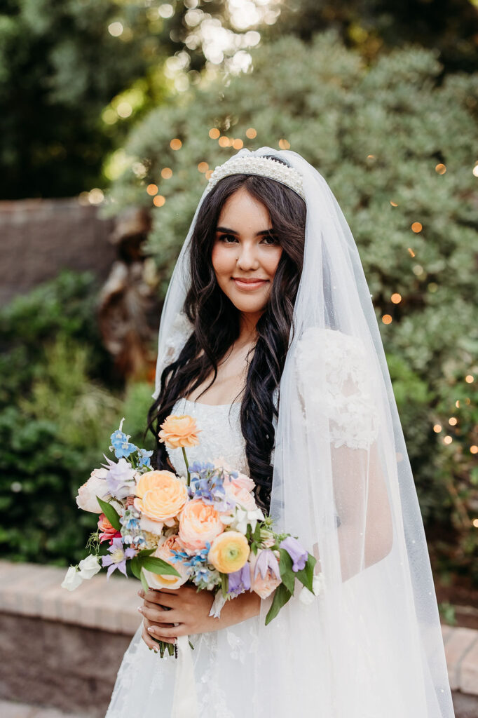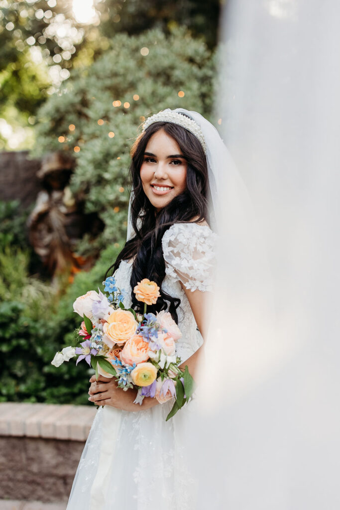 Her florals added even more charm to the morning. Warm coral roses, soft pinks, creamy whites, and pale blue touches created a fresh, elegant look that complemented the garden surroundings. The overall aesthetic was timeless, airy, and perfect for an outdoor Arizona wedding.