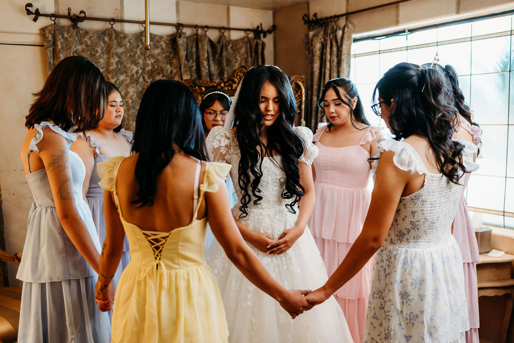 In addition, the bridesmaids gathered around Josselin for a heartfelt prayer. The moment was quiet, emotional, and filled with love. It brought a sense of grounding to the day and reminded everyone of the meaning behind the celebration.