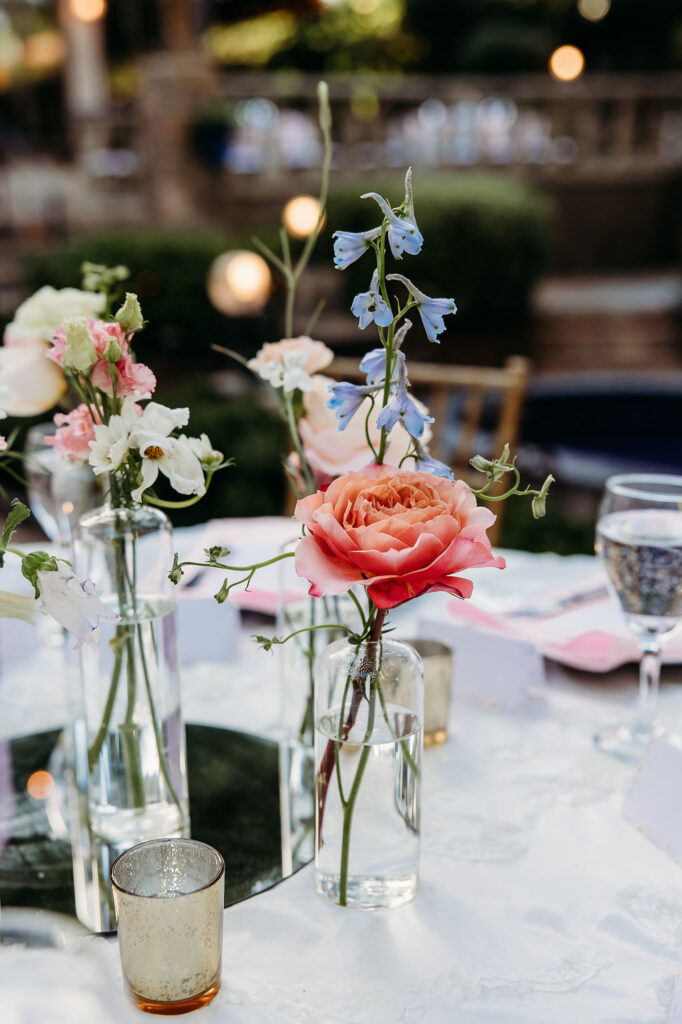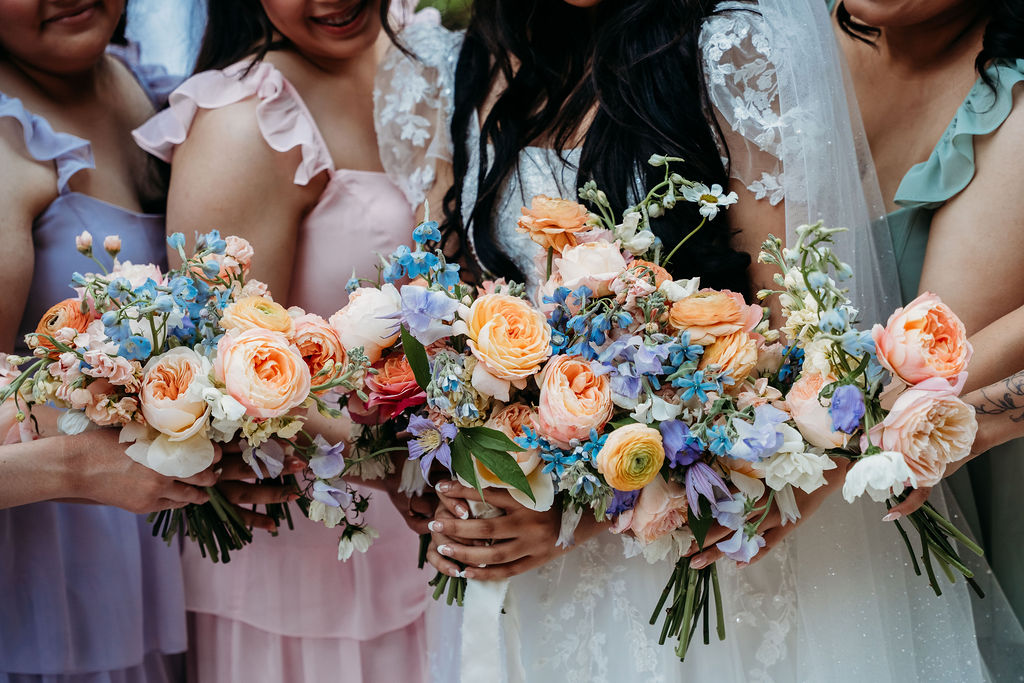 The floral arrangements brought this wedding to life. Garden roses in coral, pink, and cream, paired with soft blue accents, created a fresh, uplifting aesthetic. These florals paired beautifully with the venue’s natural greenery, giving the entire wedding a cohesive romantic look.